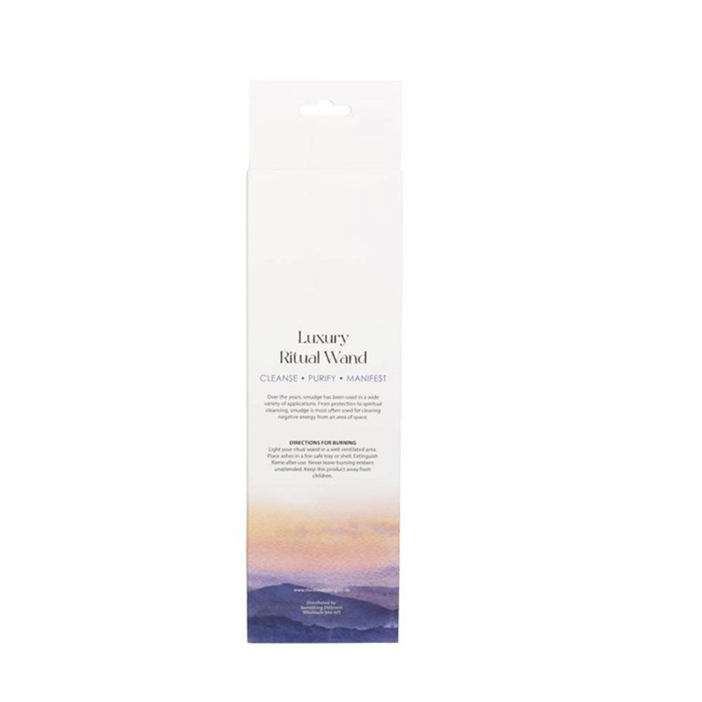 Sustainably sourced and made in the USA, this beautiful ritual wand features fragrant rosemary, lavender flowers, Palo Santo, orange peel, dried flowers and a raw Rhodonite crystal thoughtfully handtied into a tight bundle for burning and display.