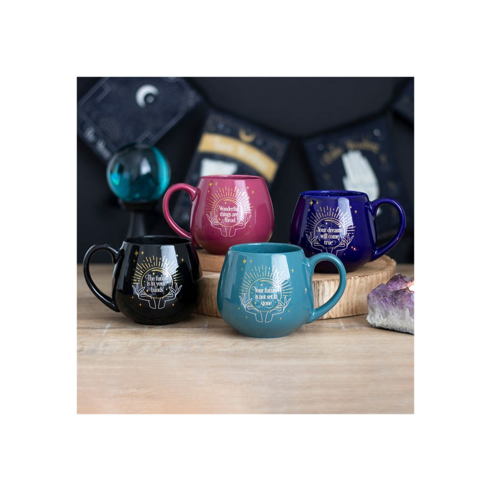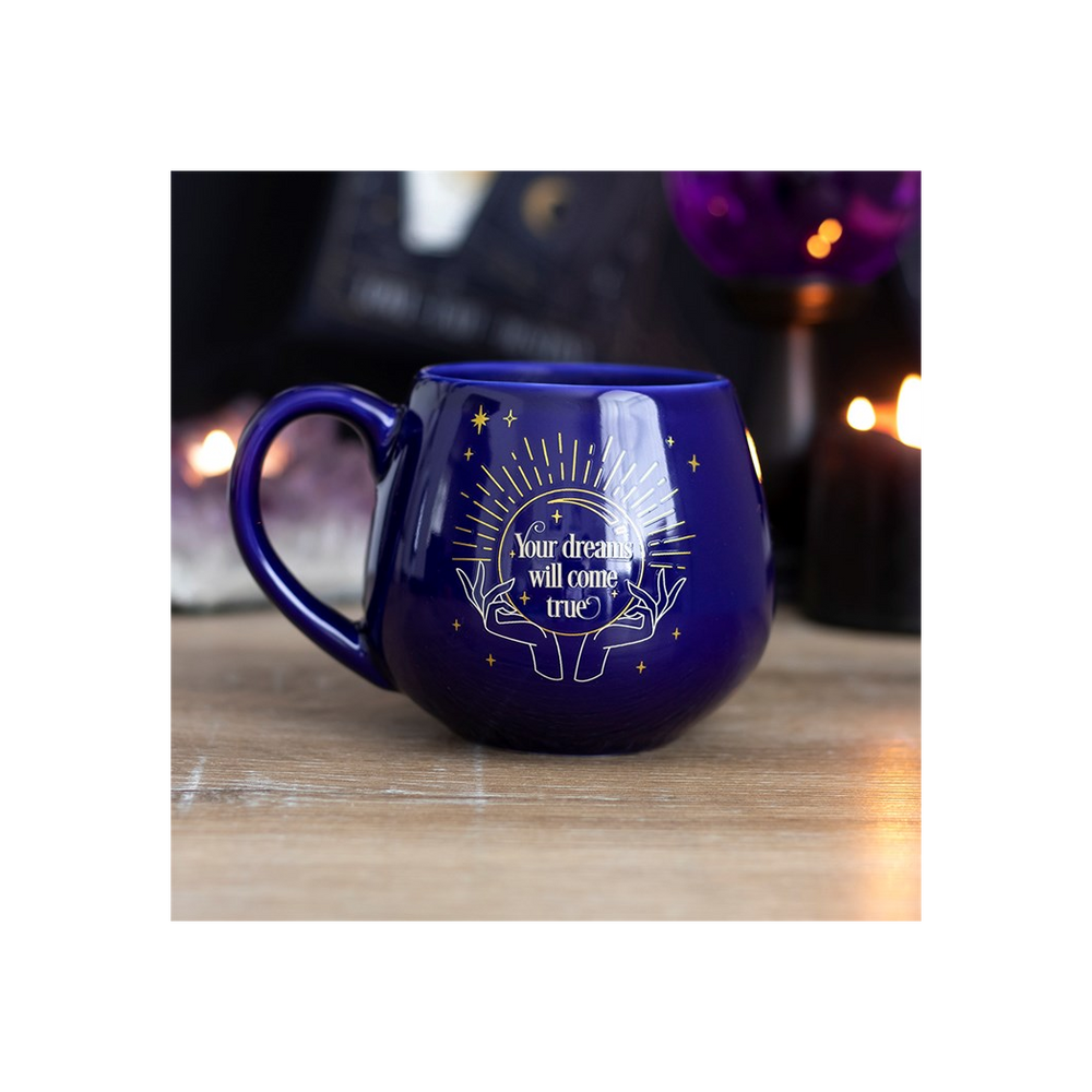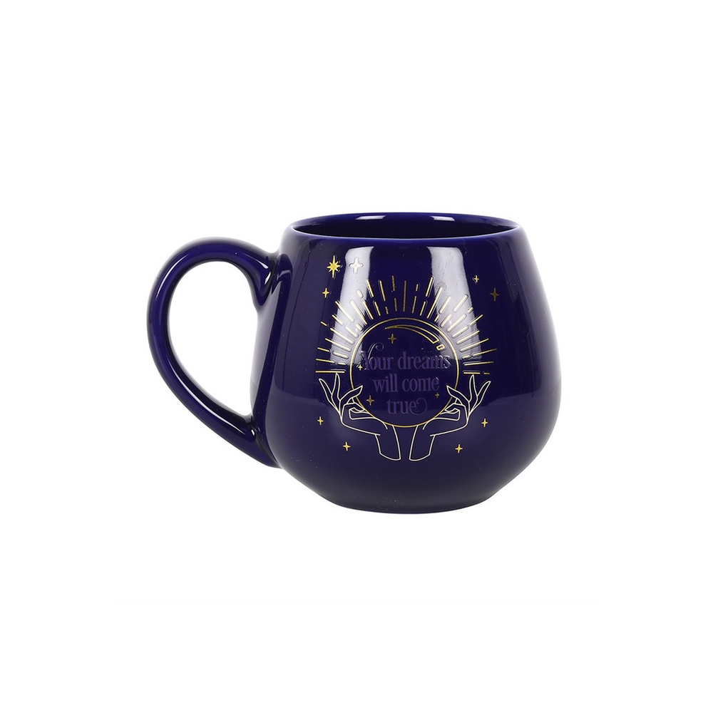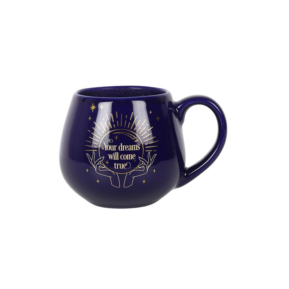 Add a hint of extra magic with every warm cup of tea. This rounded mug features a captivating colour change design that reveals a hidden fortune within the mystical crystal ball after a warm beverage is added. Hidden text reads, 'Your dreams will come true' on a blue base. Holds approximately 500ml. Do not microwave. Hand wash only. Product Dimensions: H9.5cm x W8cm x D8cm Packaged Dimensions: H10cm x W11cm x D13.4cm