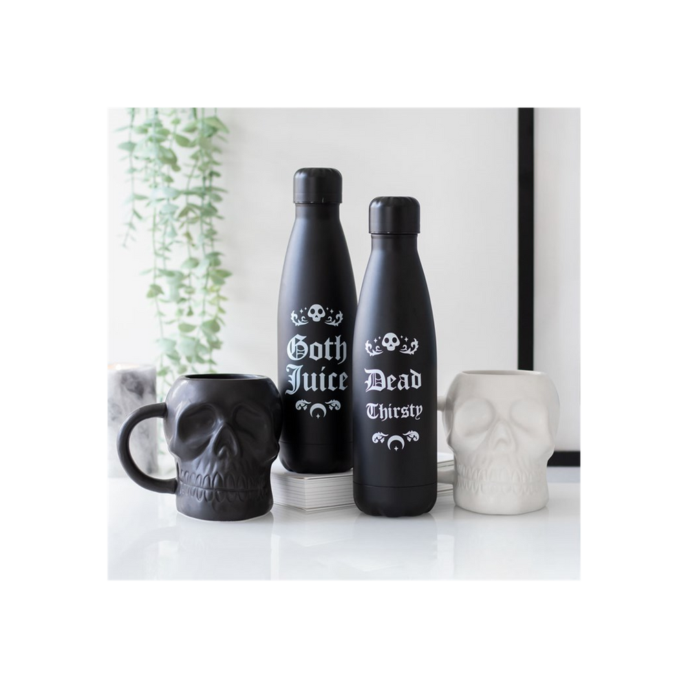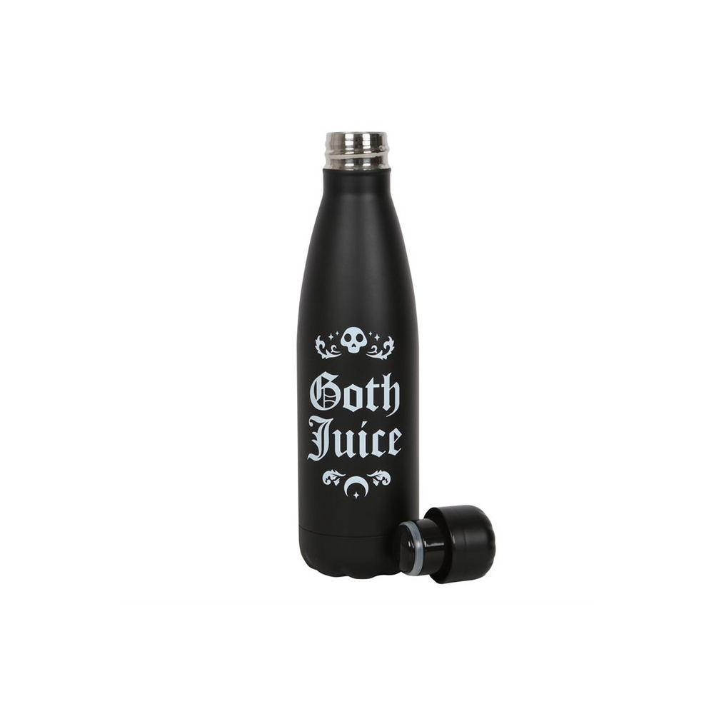 This jet black water bottle features the text 'Goth Juice' in gothic themed text.