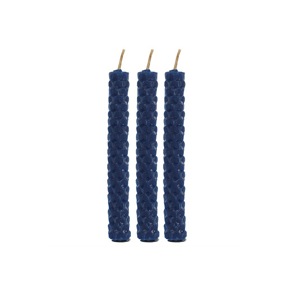A box of 6 blue Blessed Bee beeswax candles useful for spell work involving protection and wisdom.