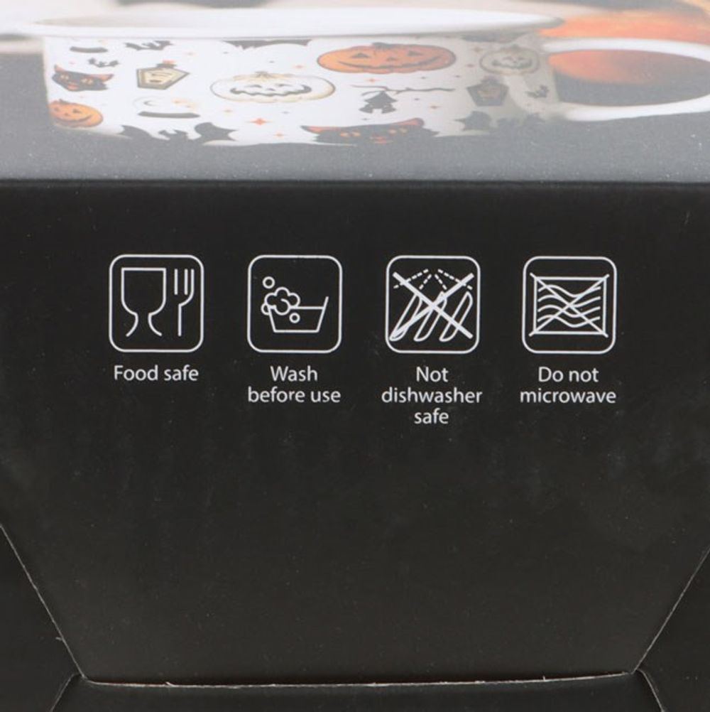 Get in the spirit of Halloween with this chunky ceramic mug featuring vintage inspired Halloween motifs like black cats, bats, potion bottles and jack-o'- lanterns.
